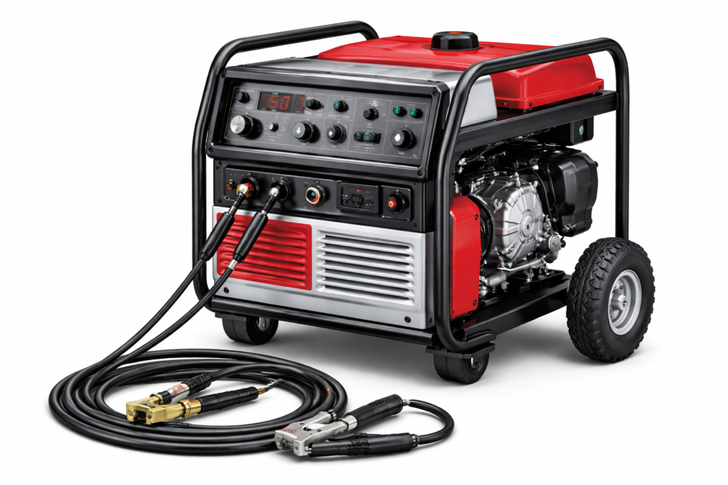 エンジンウエルダとは、ガソリンやディーゼルなどのエンジンを動力源として発電し、その電力で溶接を行うことができる溶接機のことです。電源設備がない屋外や工事現場でも使用できるのが特徴で、アーク溶接を中心に建設現場、土木工事、配管工事、設備メンテナンスなど幅広い用途で利用されています。発電機としての機能も備えている機種が多く、電動工具などの電源としても併用できるため、現場作業の効率化に役立つ機器として広く使用されています。